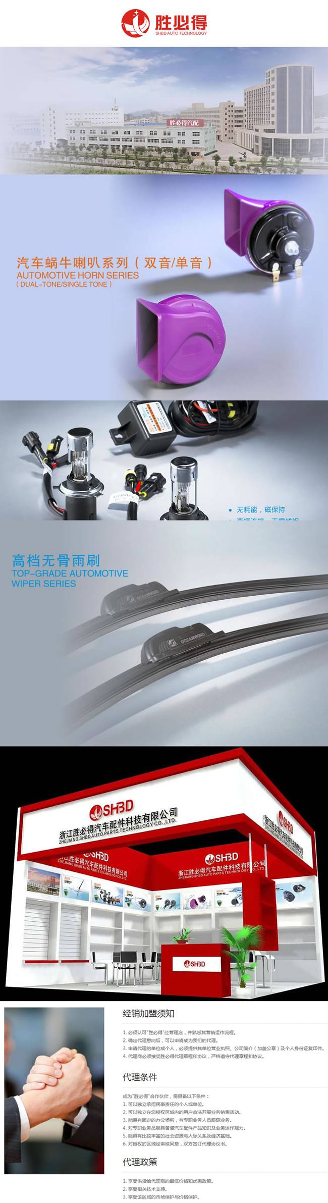 浙江胜必得汽车配件科技有限公司是专业生产各类汽车零部件的科技型企业,公司自创建以来,一直专 注于汽车零部件领域的生产制造、开发研究和技术创新。经过多年的艰苦创业,积累了丰富的生产、设 计和制造经验。公司获得国家多项“发明专利”和“实用新型专利”,荣获“科技创新型企业”称号。