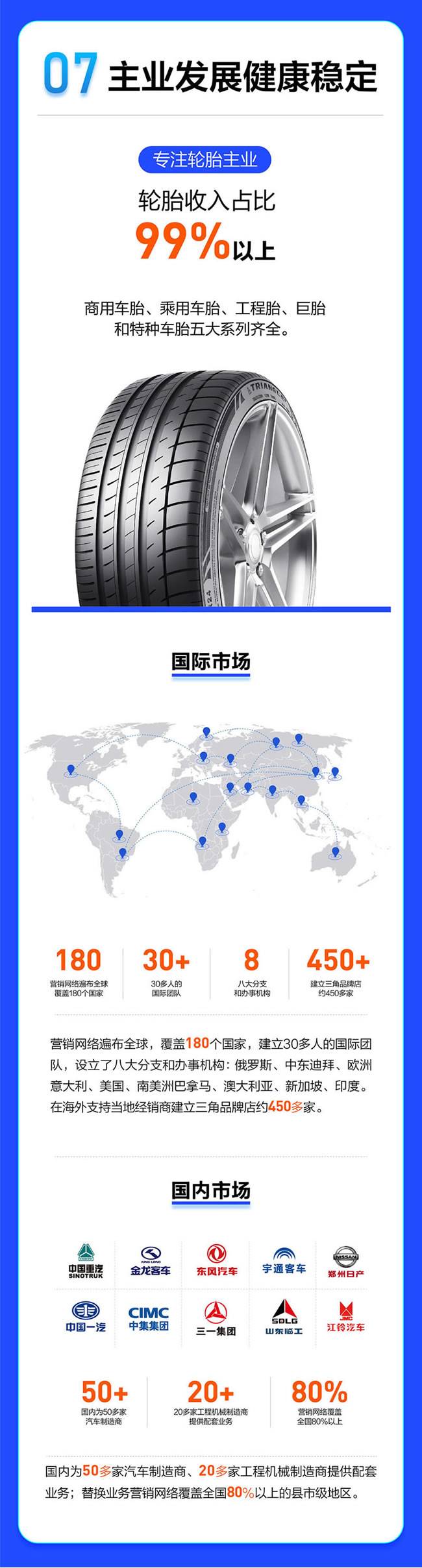 公司产品覆盖商用车轮胎、乘用车轮胎、工程子午胎和巨胎、特种轮胎等系列,是行业内品种最齐全的企业之一;市场遍及全球180多个国家和地区,并在北美、欧洲、中南美、澳洲、东南亚、中东非、俄罗斯、印度等地设有营销分支机构。