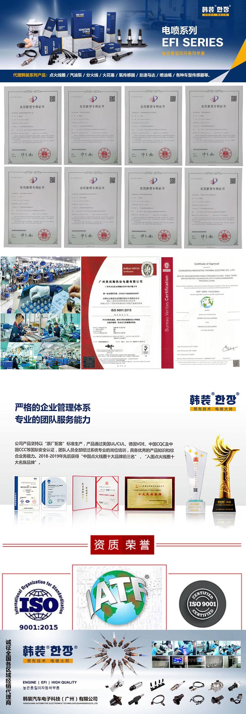 本公司创始于2008,主要经营博世、德尔福、日本电装、马瑞利、摩托罗拉、西门子等电喷系统,适用于马自达系列。现代系列、,福特系列、通用系列、三菱4g系列、4a系列。主要分为以下几个系列大全,传感器系列:(节气门位置传感器、曲轴位置传感器、凸轮轴传感器、氧传感器、进气压力传感器、水温传感器等),点火系统:(高压阻尼线、点火线圈、火花塞等),步进电机系列、节气门阀体系列、喷油嘴系列、汽车泵芯及汽油泵总成、空气流量计,继电器及电阻系列等产品。经过几年的发展,本公司实力不断壮大,尤其是本公司与韩国韩装汽车零部件有限公司合作开发的“韩装”·品牌系列的产品,环保节能,质量优良,享誉全国各地。本公司的宗旨是:“客户至上,质量,共谋发展。”我们的质量方针是:“民用级产品,高要求,品质改变动力”。我们的企业精神是:“诚信和谐。”