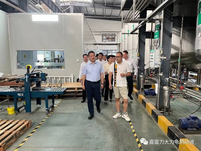 高峰书记一行先后参观了嘉富力制动液数字化调和车间及罐装生产线。调研过程中,嘉富力董事长周广来向高峰书记一行详细介绍了企业生产经营情况、公司发展形势、前景以及规划等情况,并就企业经营发展过程中需要政府给予的政策支持和需要解决的问题进行深入探讨。