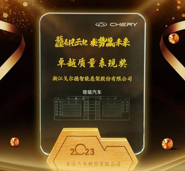 2024年1月15日,奇瑞汽车举办的“龘卷风云起,乘势赢未来”2024供应链生态圈年会活动中,浙江戈尔德荣获奇瑞汽车重量奖项“卓越质量表现奖”。